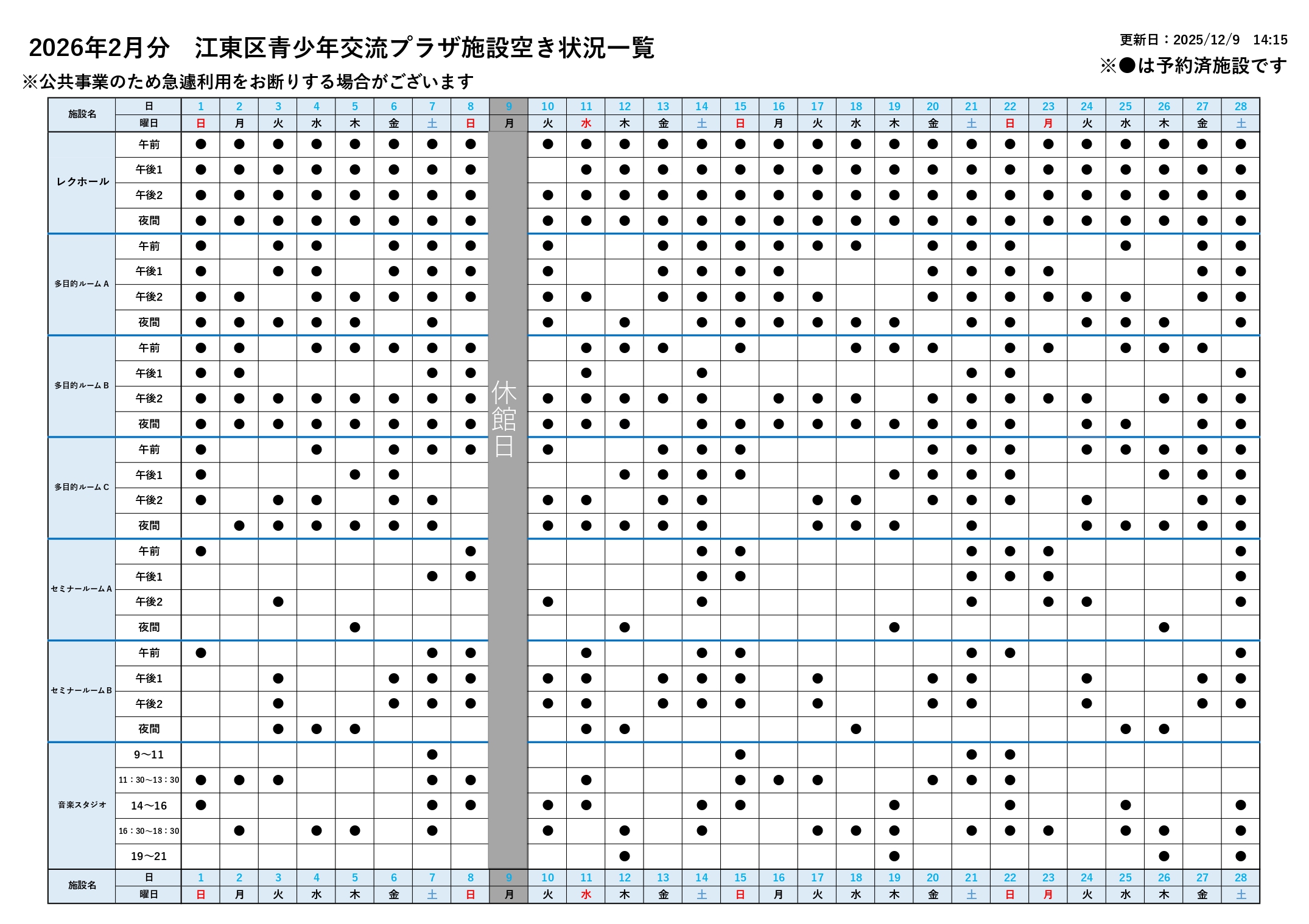 ・音楽スタジオに限り、連続したコマの申込みは2コマまでが上限となります。