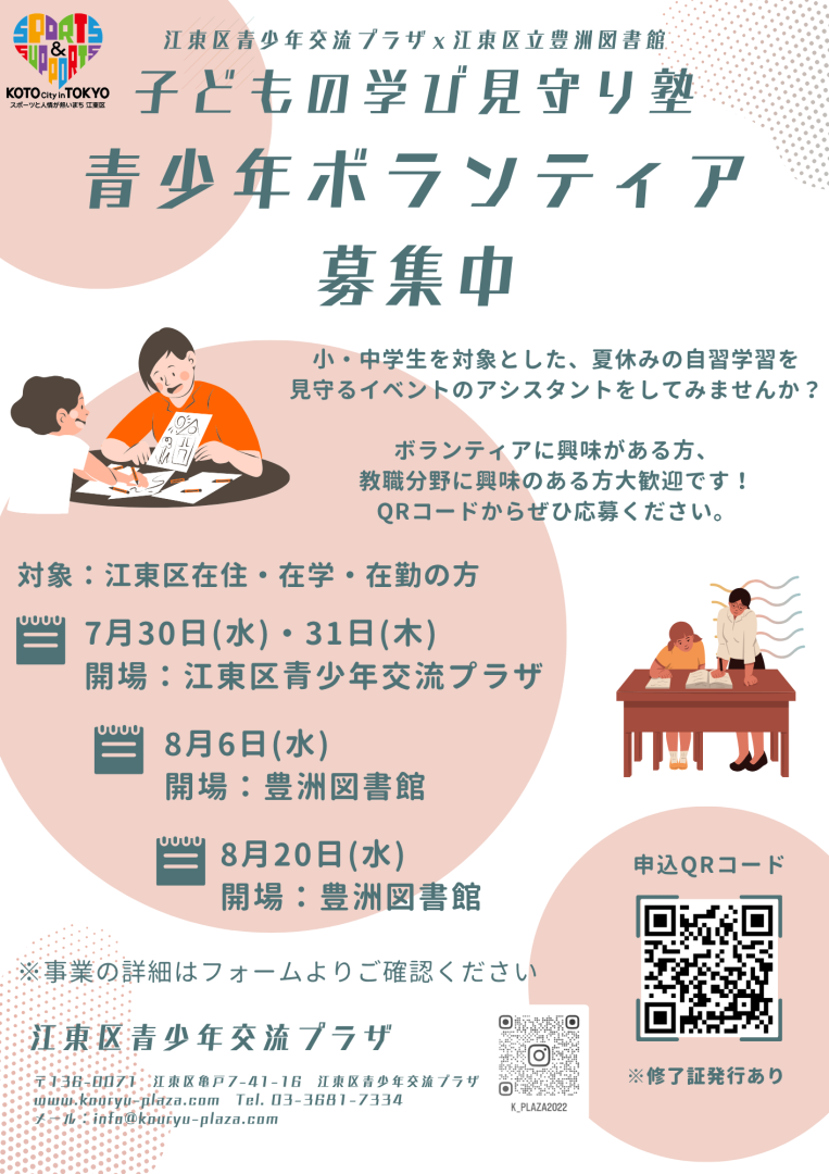 小・中学生を対象とした、夏休みの自習学習を見守るイベントのアシスタントをしてみませんか?