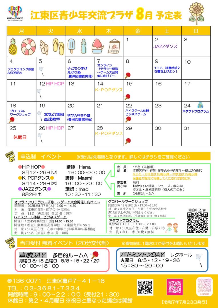 8月のイベントスケジュール等を掲載した予定表を発行しました🌞