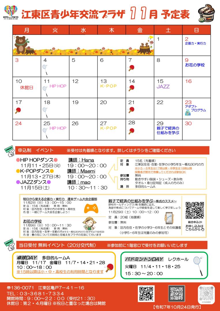 11月のイベントスケジュール等を掲載した予定表を発行しました🍁