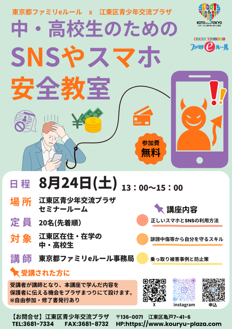 8月に中・高校生を対象としたSNSやスマホの安全教室を開催します!